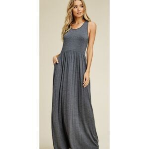 Super Comfy Sleeveless Maxi Dress in a Charcoal Color. Pocketed. 95% Rayon 5% Spandex
