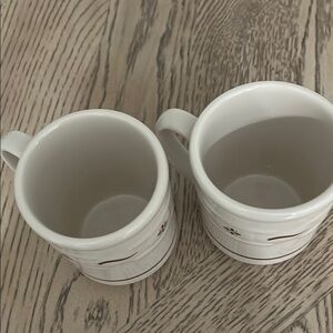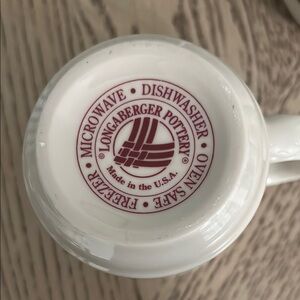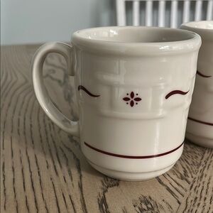 Longaberger Woven Traditions Red Mugs, which are part of the Longaberger pottery line. These mugs, often used for coffee or soup, are known for their classic design and red trim, which features a woven pattern Enjoy your favorite beverages in style with these elegant cream ceramic mugs. Featuring subtle red accents, these mugs add a touch of sophistication to your dining experience. 12 ounce size Made in USA