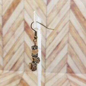 These stunning earrings feature a beautiful arrangement of brown beads delicately nestled atop a bronze cross.