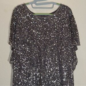 Adrianna Papell 18W Plus Gunmetal Sequin Sheath Midi Dress scalloped edges