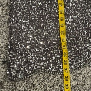 This stunning gray “gunmetal” midi dress by Adrianna Papell is adorned with shimmering sequins, making it perfect for a cocktail night out. The sheath style features a crew neck and flutter short sleeves, offering a sophisticated and stylish look. Its fully embellished fabric catches the light beautifully, ensuring you stand out at any evening event. Mother of the bride wedding party cruise elegant