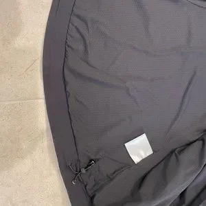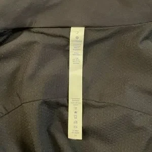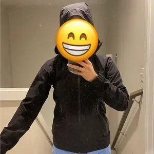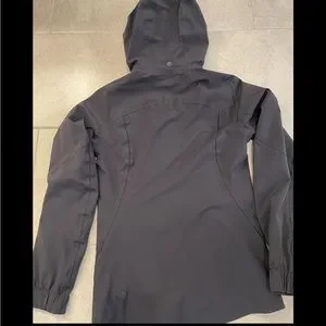 Sleek black jacket with hood. Features full zip closure. Two zippered pockets for convenience. Perfect for outdoor activities.