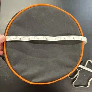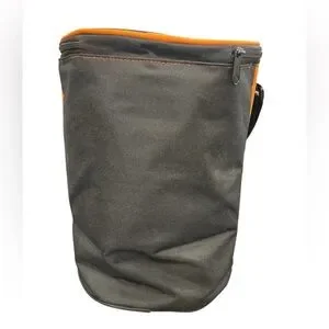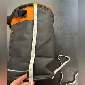 Black & orange round cooler bag. Approx 12” tall, 9” across.