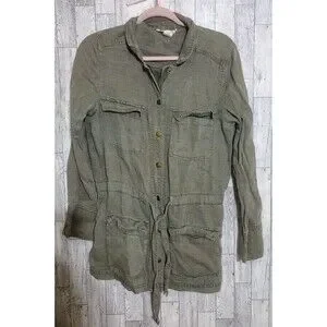 The C&C California Linen Blend Cargo Jacket in size medium is a stylish and lightweight option for women looking for a versatile outerwear piece. Made from a comfortable linen blend, this green jacket features a full zip design and multiple pockets for added functionality. The basic jacket style makes it easy to pair with a variety of outfits, making it a great addition to any wardrobe.