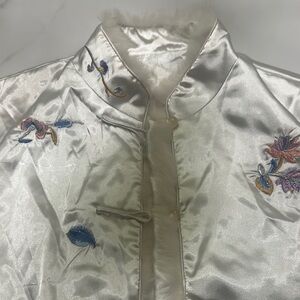 Elegant women's jacket featuring beautiful floral embroidery. The cream color adds a touch of sophistication to any outfit. 75% silk 25% Rayon. Size L - yet fits comfortably for a M and fitted for L.