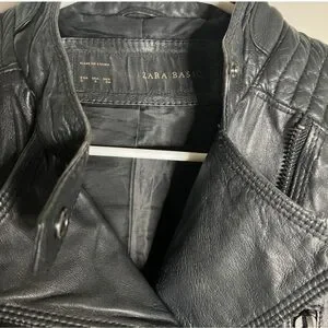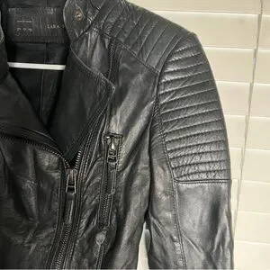 Worn twice. Like new. This Zara leather jacket boasts a classic biker silhouette with a sleek black finish and quilted detailing on the sleeves.