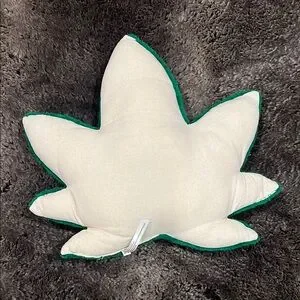 Cute green leaf shaped plush pillow with a smiling face. Features vibrant green and yellow accents.