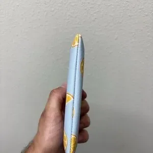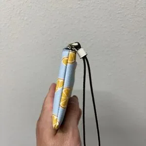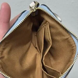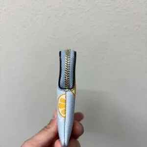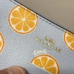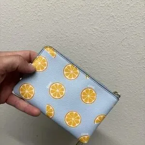 🍊Authentic COACH Blue background with Orange Slices printed coated canvas on leather Wristlet. Zip top closure; two credit card slots. Wrist strap attached.
