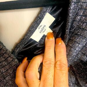 EUC Entro short black holiday sparkle top women’s size M. This is a super cute top. Perfect for the holidays. It’s a nice little short top. It does shed glitter but it’s totally worth it because it’s so cute. This would go great with jeans, skirt, or slacks. Really shimmers. Smoke free home. Measurements in last photos.