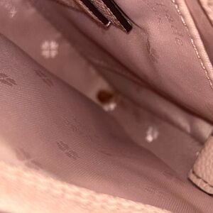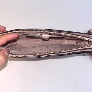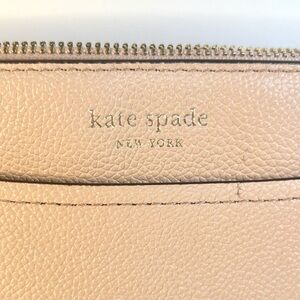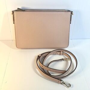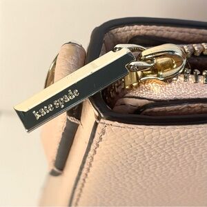 Kate Spade light pink pebbled leather crossbody with gold-tone hardware and a detachable shoulder strap. One outer slip pocket. Two inner card slots and a snap pocket. Flaws pictured in the last