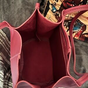 Gorgeous smooth cranberry red leather. Sleek, modern and effortlessly cool, the Devan Bucket Tote is the it-bag of the season!