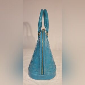 zipper top closure, footed bottom, PVC material, gold tone lips hardware, no pockets, 14" X 10". color in pic is not true color, it is more of a teal blue. good condition