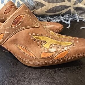 Brown, yellow, and rust/orange leather with intricate cut-out out designs and studs.