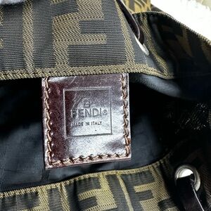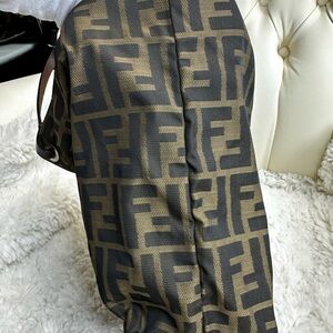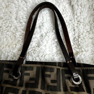 This Fendi tote bag showcases the brand's iconic FF monogram pattern in a sophisticated black and brown color scheme. Crafted from durable materials, it features a spacious design with sturdy black leather handles, making it both stylish and practical for everyday use. The timeless design and recognizable pattern make it a standout accessory for any fashion enthusiast. Pre-owned. Normal signs of used. Rubbings on the leather materials.