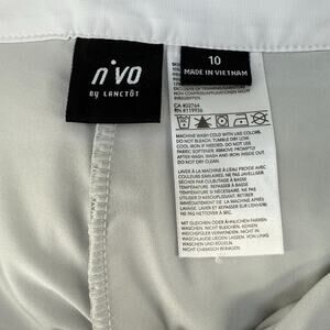 N'Vo by Lanctot Women's Skort. White and black in color. Tagged size 10. This women's N'Vo by Lanctot skort features built in stretch shorts, a hidden side zipper with hook, rear closed skit and a black trim detail. In preowned condition with minimal signs of wear.