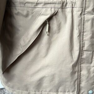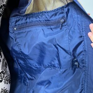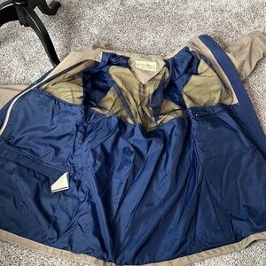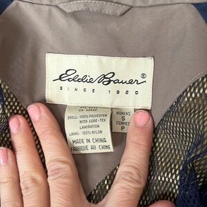 Awesome vintage Eddie Bauer windbreaker. So many zippered pockets. Adjustable to fit you! Inside mesh for breathing. Sleeves adjust as well. Zip and button up. Tan and navy. There’s some stains that need washing out/ dry cleaning. Otherwise good used conditin! The photos show all of this. Look at them carefully before buying! Aka any questions below.
