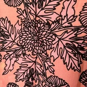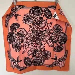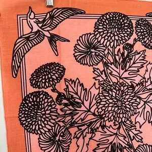 This bright pink cotton bandana with swallows and chrysanthemums is perfect for summertime. Great for wearing around your neck for a pop of color. Size is 21” x 21” square.