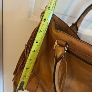 Stylish tan leather handbag with fringe details. Perfect for adding a boho touch to any outfit. This purse has been loved, it is not perfect but a great condition please see pictures.