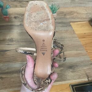 SCHUTZ Ameena Leather T-Strap Heeled Sandals Snakeskin Print Women’s Sz 6.5