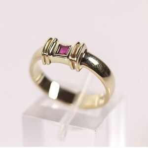 A Tiffany & Co. 18-karat yellow gold ruby ring. This ring is in excellent condition with no visible wear. Authentic. Size 6.25 Stamped Tiff Co, 18K on the inside of the ring band.