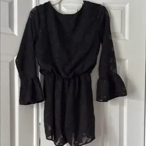 Elegant black romper with long sleeves. Features a wrap design and tie waist. Perfect for any occasion.