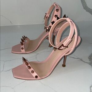 These Alexander McQueen heels feature a striking combination of delicate pink leather and edgy silver spike studs. The minimalist design includes a thin stiletto heel and two elegant straps, making them a standout statement piece for any occasion.