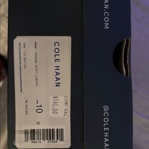 These Cole Haan flats feature a smooth tan leather finish with a gold-toned decorative detail across the vamp. The slip-on design and rounded square toe provide a comfortable fit, ideal for both casual and business casual occasions.