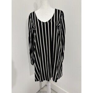 This is a Luna Chix dress in size Small with a stylish black and white striped pattern. The dress has long sleeves and is made of rayon material, making it comfortable to wear. It is a knee-length shift style dress, perfect for casual or semi-formal occasions. The dress is brand new with tags, ensuring its quality and authenticity. Perfect for women looking for a chic and versatile addition to their wardrobe.