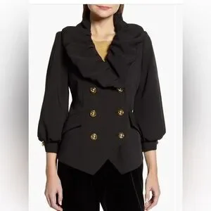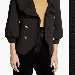 A contradiction of seriousness and frivolity, a reinvented blazer from influencer Blair Eadie with puffy sleeves, big ruffles and an angled hemline. Shiny dome buttons adorn the front and cuffs of this fashion-forward jacket from her special Halogen party capsule.