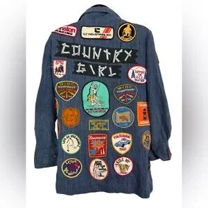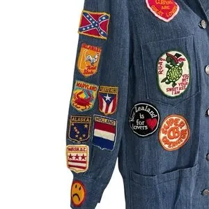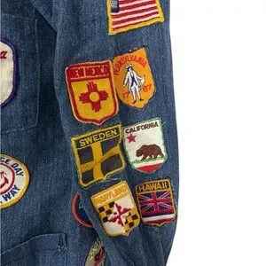 Unique vintage denim jacket featuring vibrant patches. Perfect for a bold statement. Remove the patches you don’t like, some patches seem to have already been removed from the front pockets repurpose all of the patches- it’s a project! This jacket is likely from the 60’s/70’s