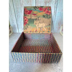 This vintage trinket box features a charming farm-inspired design with sheep, horses, and floral details. A woven multicolor fabric exterior adds rustic allure.