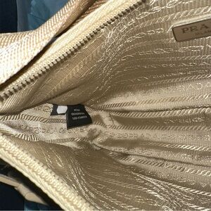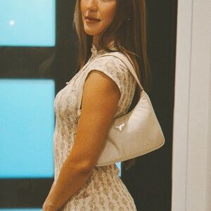 This elegant Prada shoulder bag in a chic cream color showcases the brand's iconic triangular logo plaque. Crafted from Prada's signature nylon, it features a sleek, minimalist design with a short shoulder strap, making it a versatile accessory for any occasion. Comes with box and all official tags and authenticity card as well as additional drawstring bag that came as an additional gift and dust bag. Used twice, like new with exception of faint mark on back. See pictures. Send an offer!
