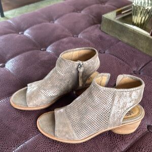 Experience the perfect blend of style and comfort with Sofft's tan/metallic sandals featuring a breathable perforated upper and a convenient slingback strap. These sandals are ideal for everyday wear, offering a versatile tan hue that pairs effortlessly with any outfit. Enjoy the casual elegance and comfort of these summer-ready sandals.