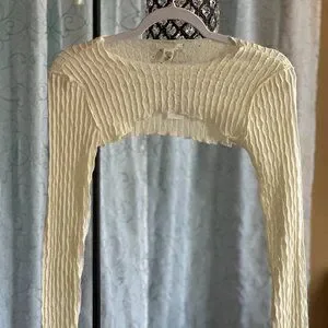 Add the perfect finishing touch to any outfit with this cream-colored textured bolero shrug from Full Tilt. Made from a soft and stretchy blend of 90% nylon and 10% spandex, it features a unique wrinkle-textured fabric that adds dimension and style. This closed-front shrug has a cropped fit, ideal for layering over dresses or tanks. Brand new with tags and in flawless condition. Size Small.