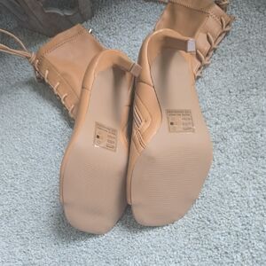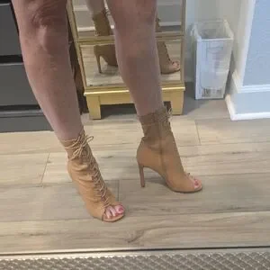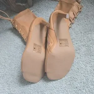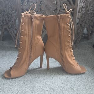 Step out in style with these chic tan lace-up peep toe heeled boots. Perfect for a night out! Never worn. No box.