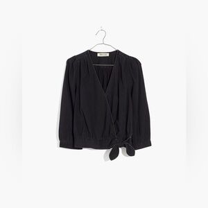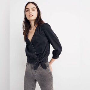 this borrowed-from-the-'70s black denim top ties at the side for a wrap vibe.