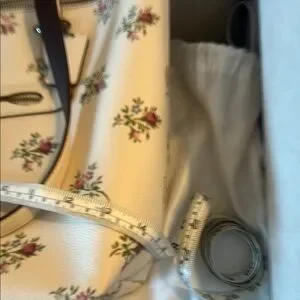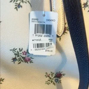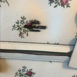 NWT Coach tote bag showcases a beautiful white base adorned with a delicate floral pattern, exuding elegance and versatility. Its structured design ensures ample space and cute outside zip pocket (large enough for cell phone) for your essentials, making it an ideal choice for everyday use. The leather handles enhance its sophisticated appeal, making it a timeless accessory. Please see pictures for measurements.