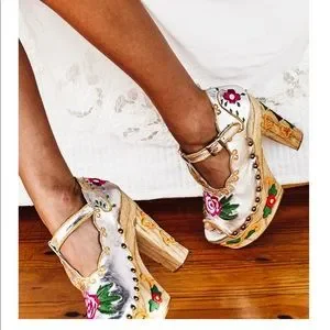 Stylish silver platforms with vibrant floral embroidery. Features pink, green, and orange accents. Chunky wooden heel for added height.