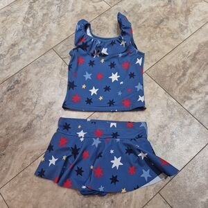 Hanna Andersson 2 piece swimsuit. Excellent used condition. Charming blue swimsuit featuring a playful star design. Includes red, white, and navy stars. Ideal for beach or pool fun. size 6/7.