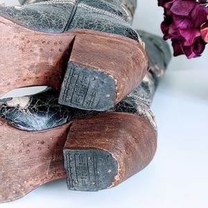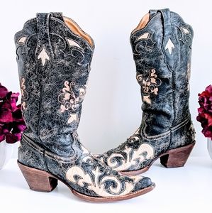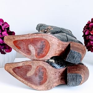 Elegant black boots with intricate cream embroidery. Stylish heeled design. Perfect for any occasion.