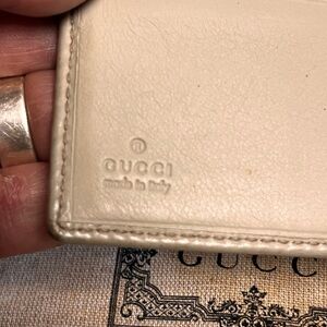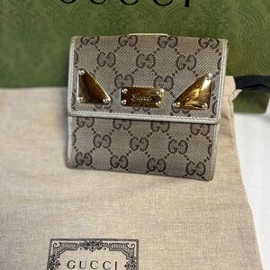 Gucci Guccissima Compact Wallet Brown and Gold Wallet Off white Leather with Iconic GG Monogram Monster From the unmatched collections of Gucci, this splendid French wallet looks outstanding. Crafted in beige Guccissima monogrammed canvas, it features brown leather trim and top handle. A gold-tone detailed flap closure opens to a leather and fabric-lined interior with ten card slots and two slide pockets.