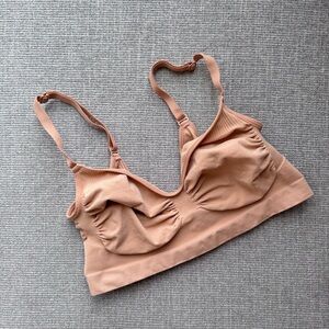 Discover unparalleled comfort with the SKIMS Tan Seamless Bra, featuring a wireless design and adjustable straps for a personalized fit. Crafted from a smooth, stretchy fabric, this minimalist bra offers light padding for everyday wear. Its versatile tan color makes it an ideal choice for layering or as an undergarment.
