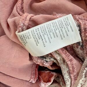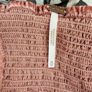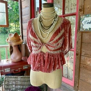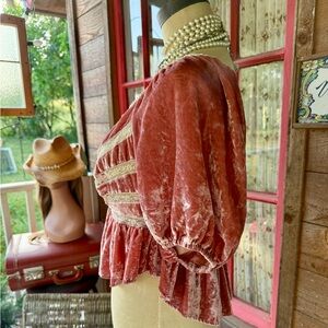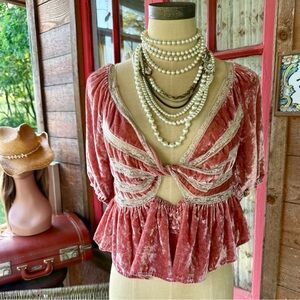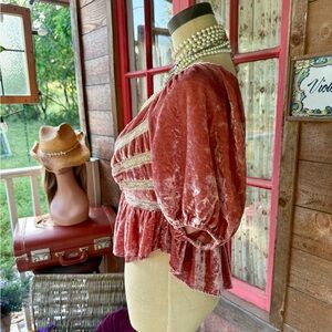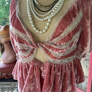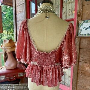 * Soft velvet fabrication, deepV neckline, puffy short-sleeves, feminine lace detailing, scooped back shoulder-line, ample gathering around waistline/peplum, puckered back design