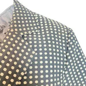 This vintage Willi Smith blazer exudes timeless sophistication with its tailored fit and textured oval pattern. Its classic black and off-white color scheme is complemented by 3/4-length sleeves and button details, making it an elegant and versatile addition to any wardrobe. Perfect for those who appreciate vintage charm and refined design.
