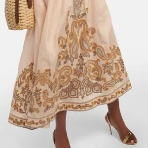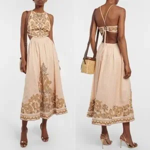 Flourishing with Zimmermann's bohemian essence, the Devi midi dress is made of linen that's embroidered with ornate paisley motifs. This halterneck style has a cutout bodice with a boned structure, supported by crossover rouleau straps.
