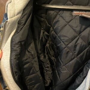 Stay stylish and warm with the blue plaid quilted flannel jacket with gray hooded insert. Zipper and button closure. 3 1/2 pounds. 30 inches long and 24 wide. Known to be durable and comfortable. Never worn or even fully unbuttoned. Smoke free home