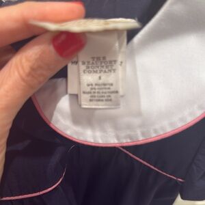 Charming navy dress with a white Peter Pan collar. Features puff sleeves and a cute gift box applique. Worn once!