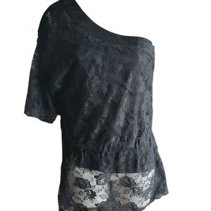 This charming black lace one-shoulder top is perfect for a night out. Contrast satin trim, one shoulder elasticized waist, peplum hem, sheer with lining. The intricate lace design adds a touch of sophistication. Pair it with your favorite jeans or skirt for a chic look. New, without tags.