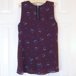 This versatile sleeveless blouse features a double layer of floral printed chiffon, a split V-neckline, longer tunic length and an exposed zipper in back. The perfect layering piece. In excellent preowned condition!