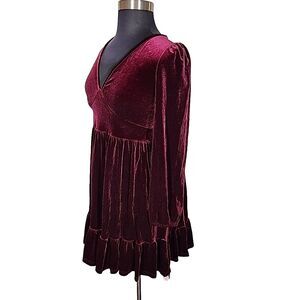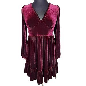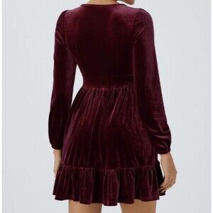 Halara Burgundy Velvet Deep V Neck Long Sleeve Ruffle Hem Dress Size XL